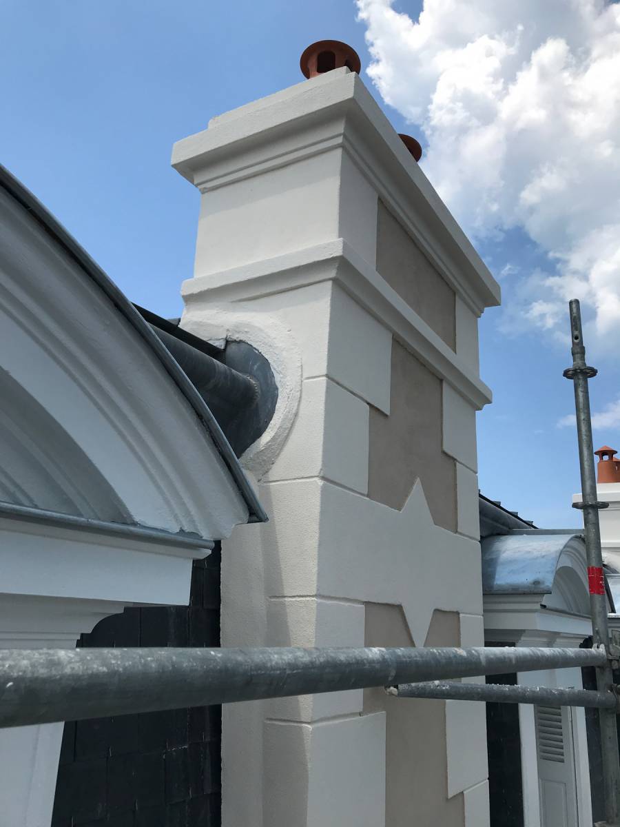 En résumé :Mise en sécurité et scission des réseaux des colonnes montantes (concessionnaires CF/GAZ/AEP/Cf), ravalement des façades par enduits à la chaux après retrait des enduits en ciment et mise en peinture des supports de chéneaux, remplacement des garde-corps, réfection des chéneaux et des lucarnes, réfection des réseaux d'évacuation des EAux Usées.
